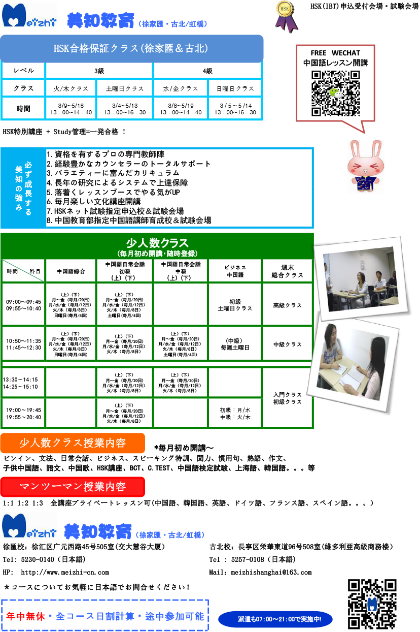 上海美知中国語学校は仕事場や学校、お友達との集まりの場所から、気軽に直行していただけるよう指折りの繁華街、徐家匯(地下鉄1号線、9号線、10号線・上海交通大学すぐ横-浦東空港、陸家嘴、上海駅、人民広場、静安寺、上海図書館、嘉定、打浦橋、八万人体育館、上海南駅、莘庄、七宝方向から便利です。)と虹橋古北(日本人をはじめ外国人が多く居住する高級住宅街で、青浦、虹橋空港、天山路、仙霞路、延安西路、上海動物園、龍柏、呉中路から、便利です。)に中国語教室を構えています。授業内容はピンインから学ぶ基礎中国語から、文法を中心とする授業、日常生活会話、ビジネス会話、中国語検定試験対策、駐在員の方への企業語学研修、上海家庭教師派遣、上海短期留学|プチ留学プログラム、インターネットライティング講座、WEBオンライン中国語ライブレッスン、生徒さんそれぞれに合わせたHSK1級~6級対策講座などが設けられています。集中的に行われる短期特別講座から、通常コースとして数ヶ月も前から計画的に行われる長期講座があります。レッスンは生徒さんのペースできめ細かく指導するマンツーマンレッスンと、1クラス1人~8人(基本3・4人)のグループレッスンと幅広く対応しています。美知の講師はすべて対外漢語資格証、教師資格証を所持しており、また当学院の書類審査、面接試験、模擬講義試験などの難関をクリアした優秀な講師ばかりを取り揃えています。また日本で長年生徒に教えていた専門講師から授業方法を指導され、中国語学習における日本人の習慣や弱点なども十分に把握しています。あなたが探している理想の中国語学習スタイルが、ここ美知ミチゴガク(徐匯校・古北校)できっとみつかるはずです。あなたのご参加を心よりお待ちしています。