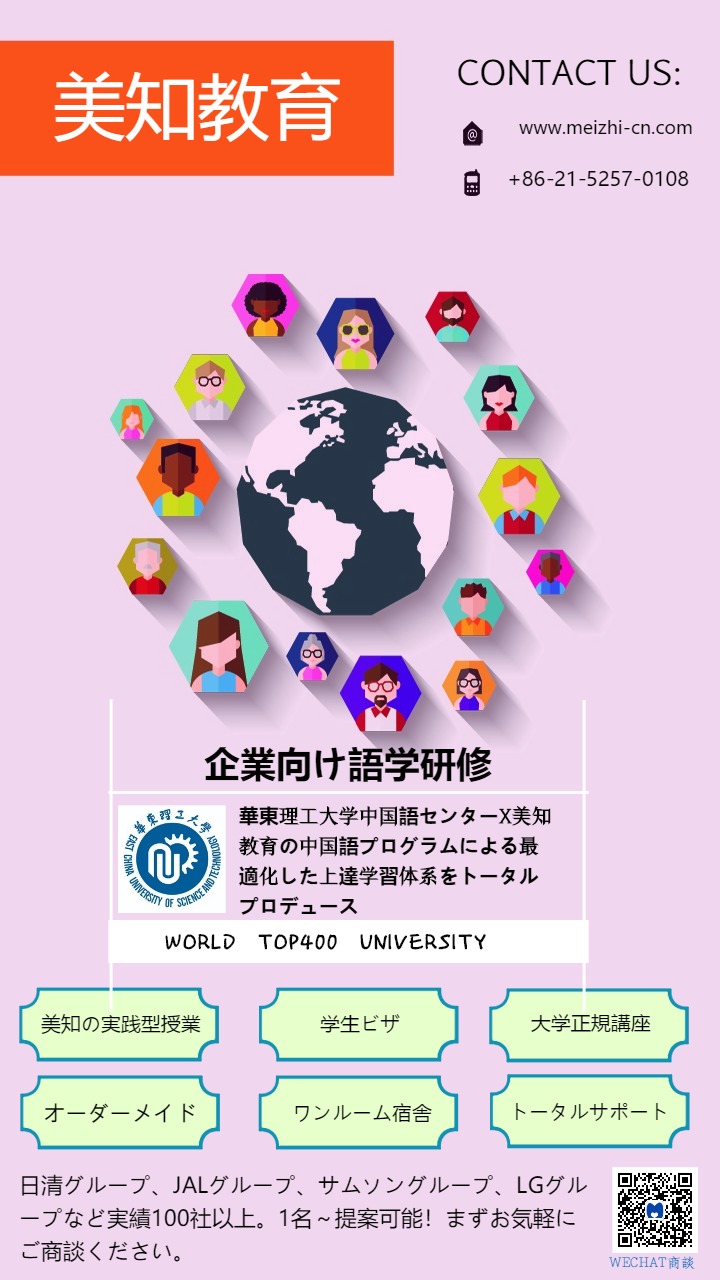 上海美知中国語学校は古北(日本人をはじめ外国人が多く居住する高級住宅街)に中国語教室を構えています。授業内容はピンインから学ぶ基礎中国語から、文 法を中心とする授業、日常生活会話、ビジネス会話、中国語検定試験対策、駐在員の方への企業語学研修、上海中国語家庭教師派遣、上海短期留学|プチ留学プログラム、インターネットライティング講座、WEBオンライン中国語ライブレッスン、生徒さんそれぞれに合わせたHSK1級~6級対策講座などが設けられています。上海で中国語を本格的に楽しく身につけたい人の為の中国語教室なら、「美知」へ! 古北校:上海市長寧区紅宝石路533号210室(花世界2階) 電話:+86-21-52570108 HP:www.meizhi-cn.com E-mail:meizhishangahi@yahoo.co.jp
